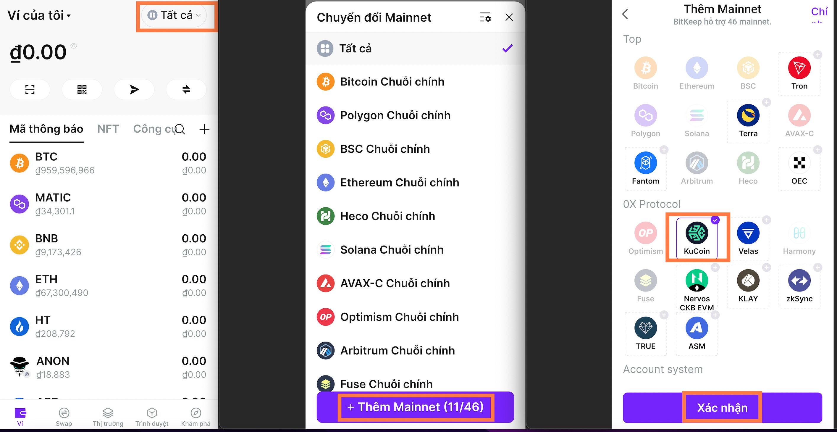 Mở ứng dụng BitKeep. Nhấn Tất Cả ở góc trên bên phải để vào giao diện lựa chọn chuỗi chính. Nhấn vào Thêm chuỗi chính, chọn KuCoin (KCC) và nhấn OK;